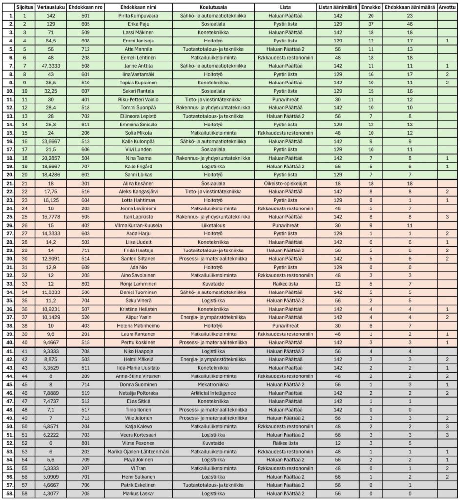 Vihreällä pohjalla olevat ehdokkaat sijoituksiltaan 1.-20. on hyväksytty edustajiston varsinaisiksi jäseniksi. Punaisella pohjalla olevat ehdokkaat sijoituksiltaan 21.-40. on hyväksytty edustajiston varajäseniksi. Harmaalla pohjalla olevat ehdokkaat sijoituksilla 41.-58. jäivät valinnan ulkopuolelle, eivätkä näin ollen tulleet valituiksi edustajistoon. Onnittelut valituille ja kiitos jokaiselle rohkealle edustajistovaaleihin ehdokkaaksi lähteneelle!