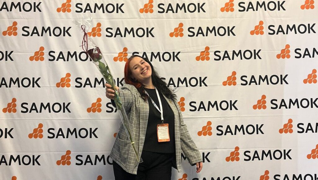 SAMOKin liittohallitukseen vuodelle 2026 vastavalittu Suvi Savola onnitteluruusun kanssa liittokokouksessa.