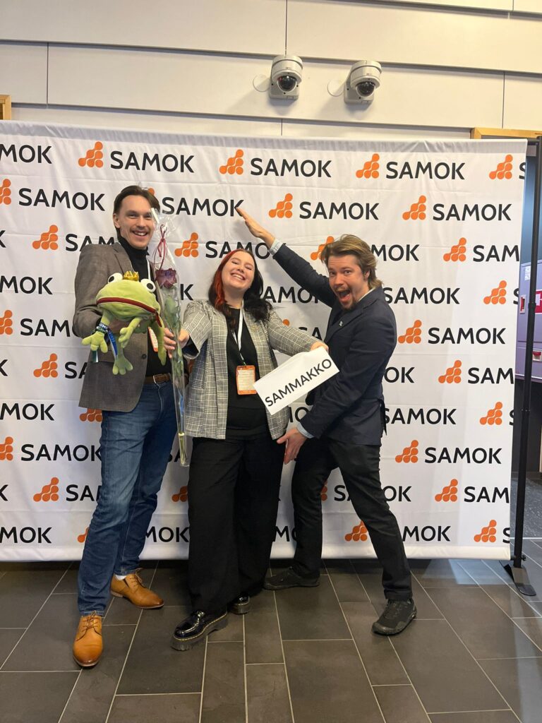 Opiskelijakunta SAMMAKKOn edustajat SAMOKin liittokokouksessa Seinäjoella 30.-31.10.2025. Kuvassa vasemmalta oikealle Atte Mannila, Suvi Savola ja Kaapo Kalliomäki.